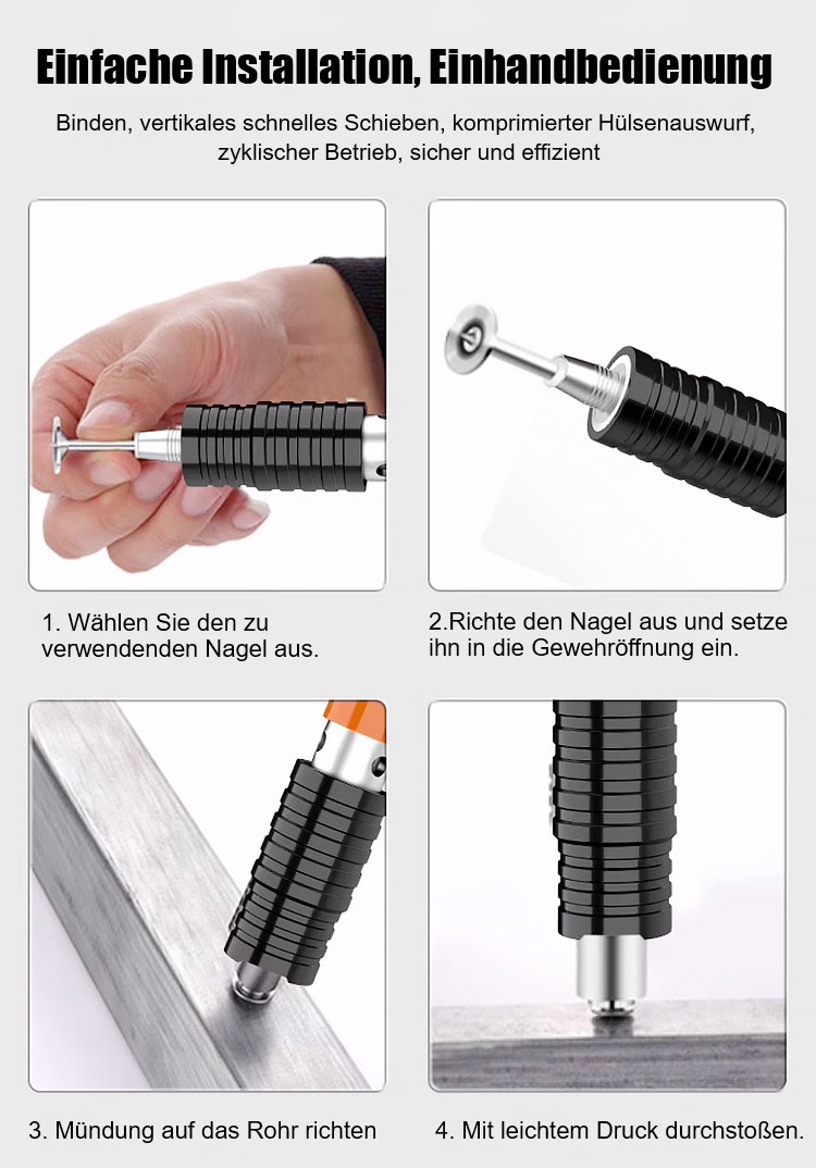 Manuelle Nagelpistole mit Schalldämpfer🎊Hergestellt aus Luftfahrt-Aluminiumlegierung✨, dauert die Befestigung von Gegenständen nur zwei Sekunden⚡. Keine Stromversorgung erforderlich, einfach den Nagel einfügen und den Knopf drücken🌟.