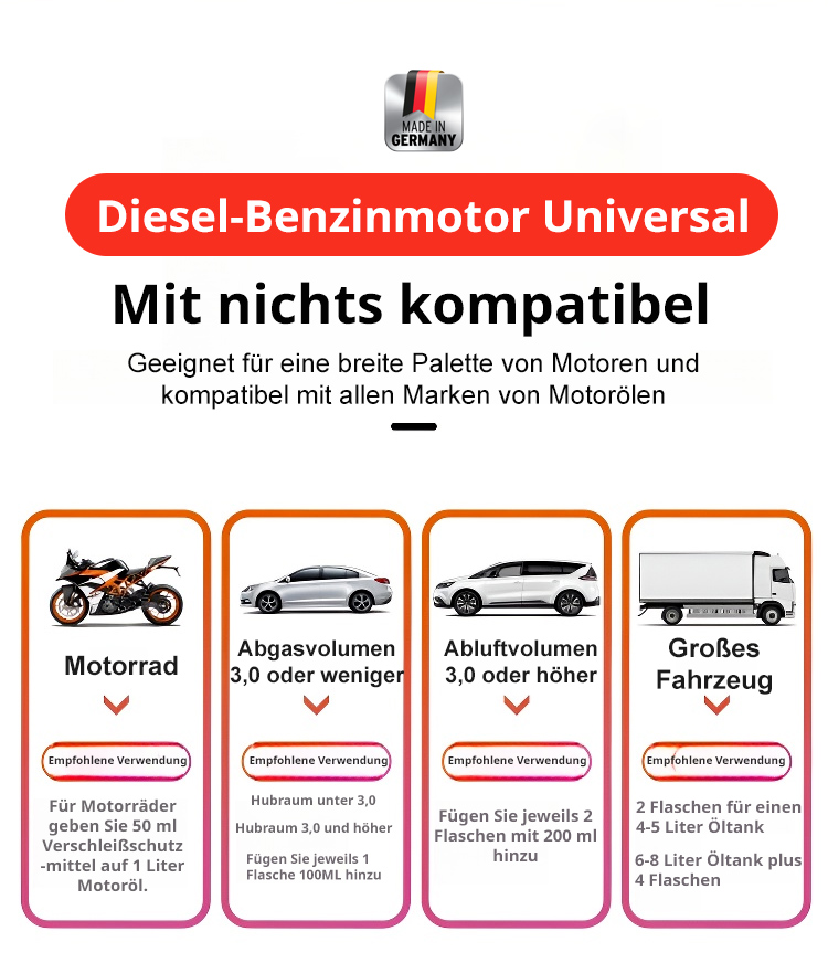 Ein Monat Nutzung verlängert die Motorlebensdauer um 20 Jahre ✨Spart jährlich über 2.000 Euro Kraftstoffkosten bei 100.000 km ✨Nach der Anwendung wird das Motorgeräusch um 20 Dezibel reduziert ✨