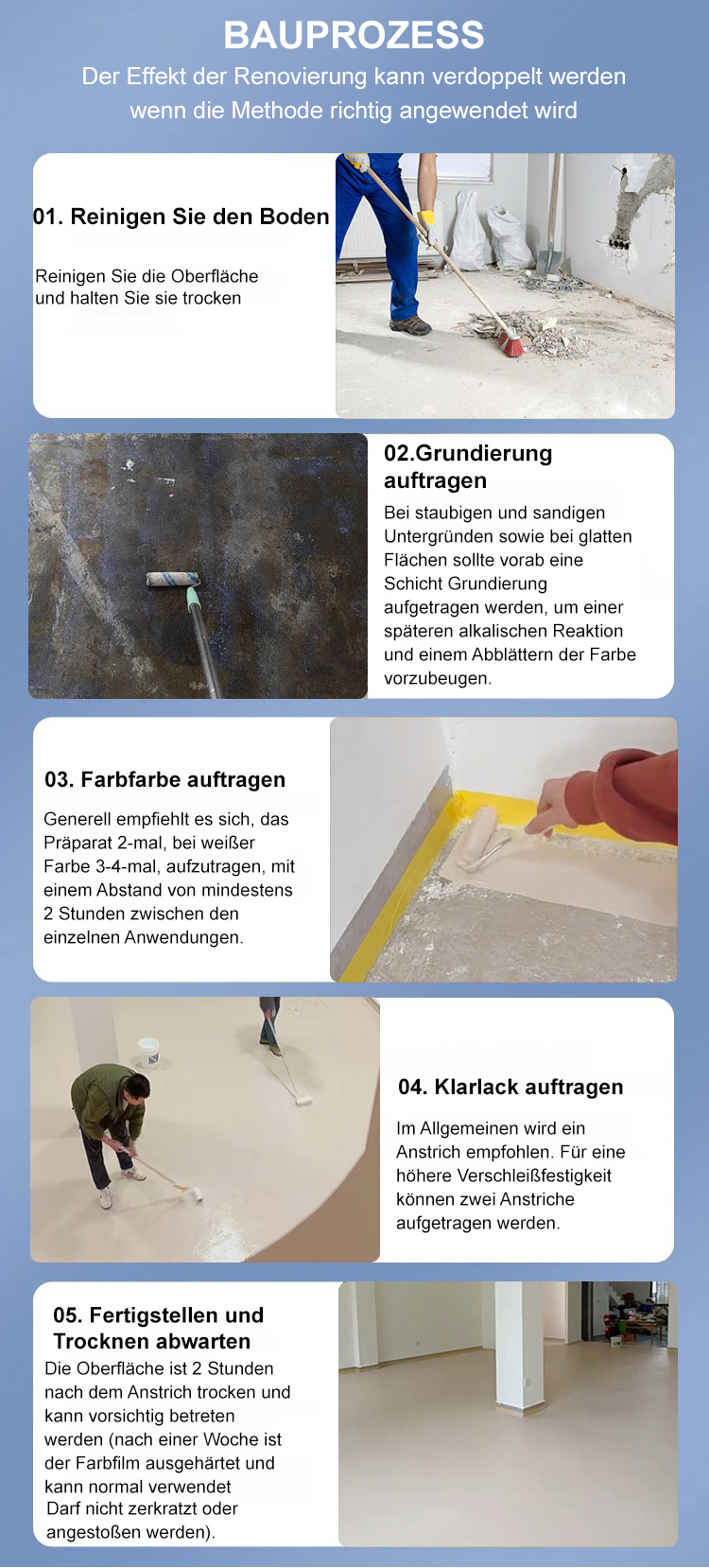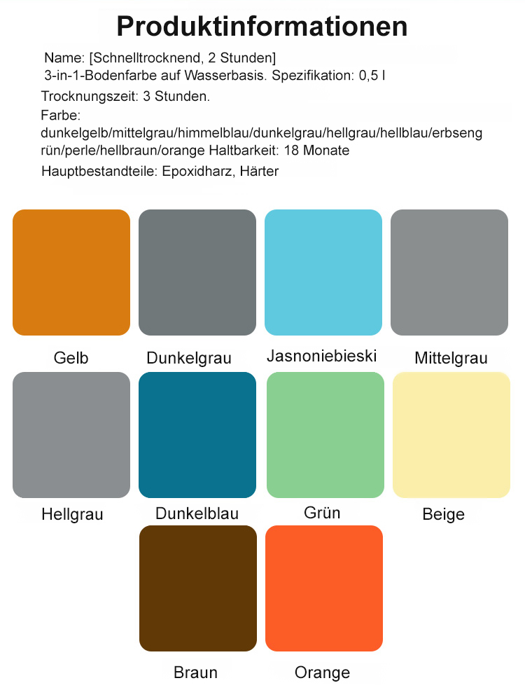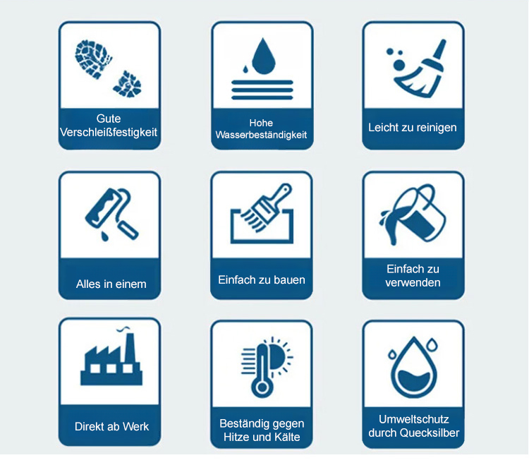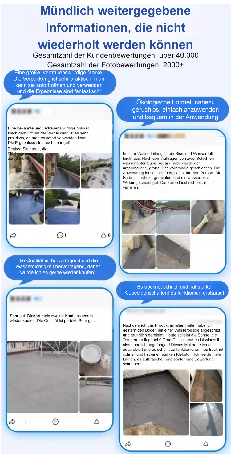Einfach den Eimer öffnen und mit dem Streichen beginnen. In zwei Stunden vollständig trocken, verwandelt es schmutzige Böden in eine edle Optik. Kein Fachpersonal erforderlich. Das Material ist umweltfreundlich, ungiftig und geruchlos. Sollten innerhalb von zehn Jahren nach der Anwendung Probleme auftreten, übernehmen wir alle Ihre Verluste. Die Werbeaktion endet in den letzten zwei Stunden.